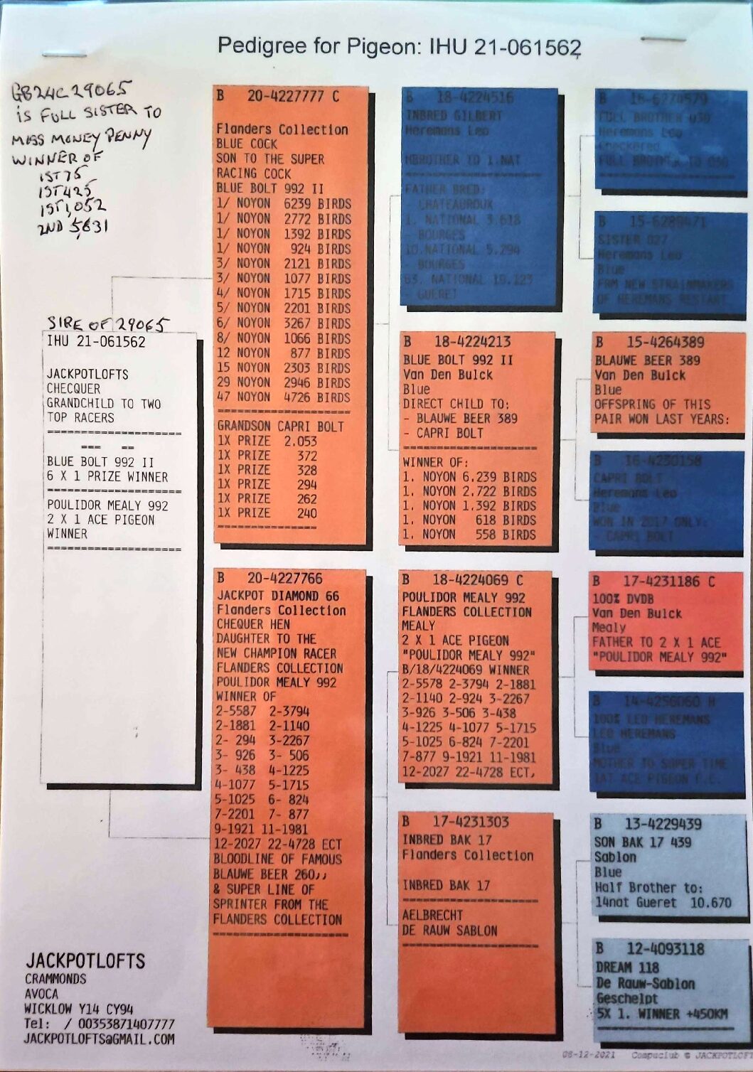 Dalecrest Lofts Stock & OB Race Team Clearance – LOT 7 – GB24 C 29065 – Cheq Hen – Full Sister Of 218th Open NIPA Kilbeggan (14,157 b) & 127th Open NIPA Roscrea (16,479 b) – Full Sister Of ‘007’ – 1st Section C & 2nd Open NIPA Bude – Daughter Of ‘JACKPOT 562’ x ‘GENUINE RISK’
